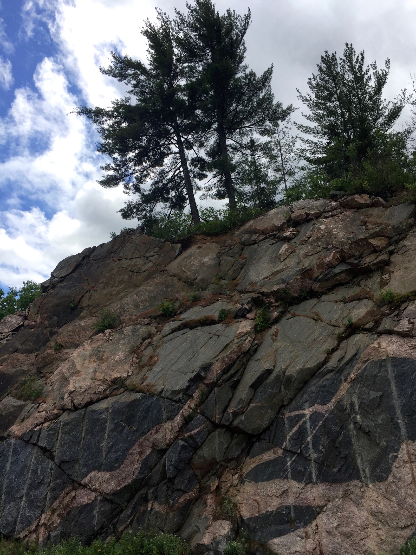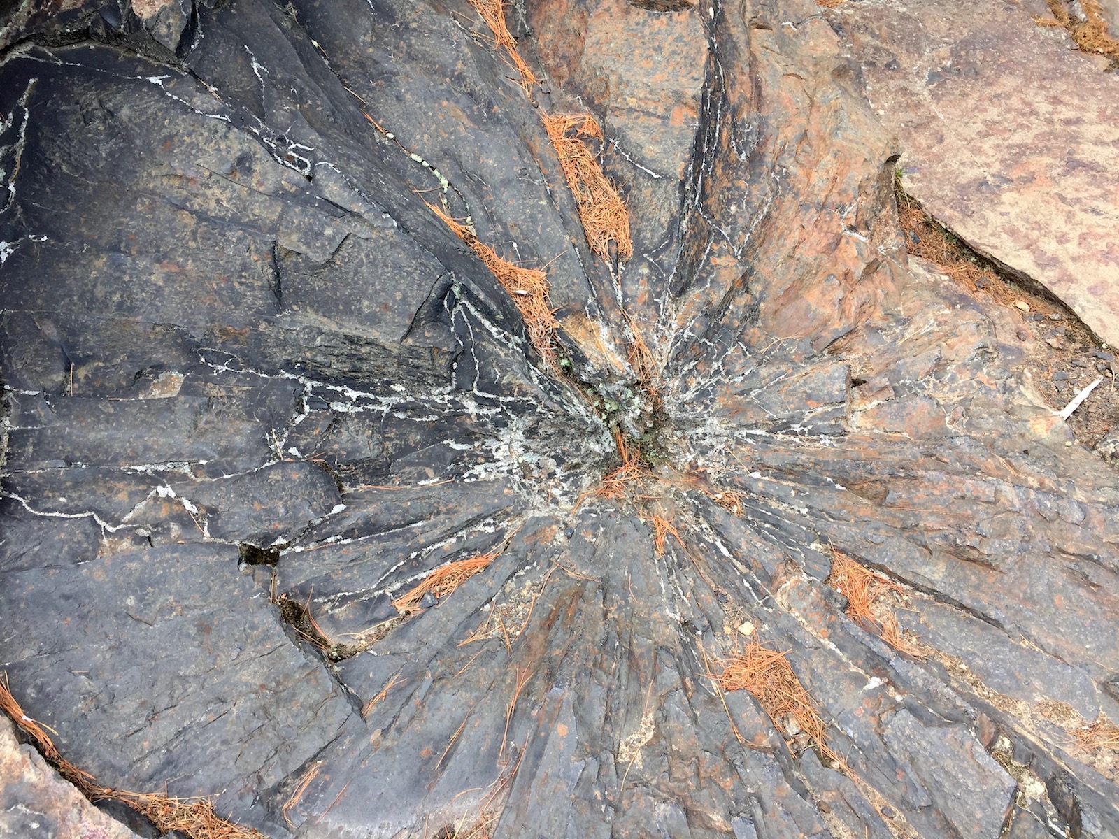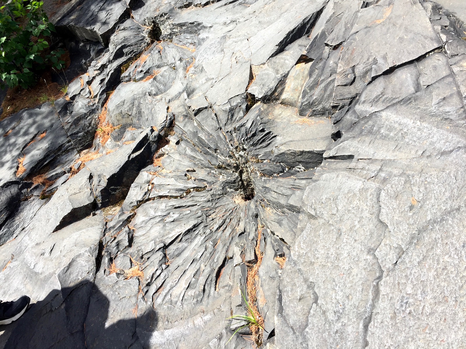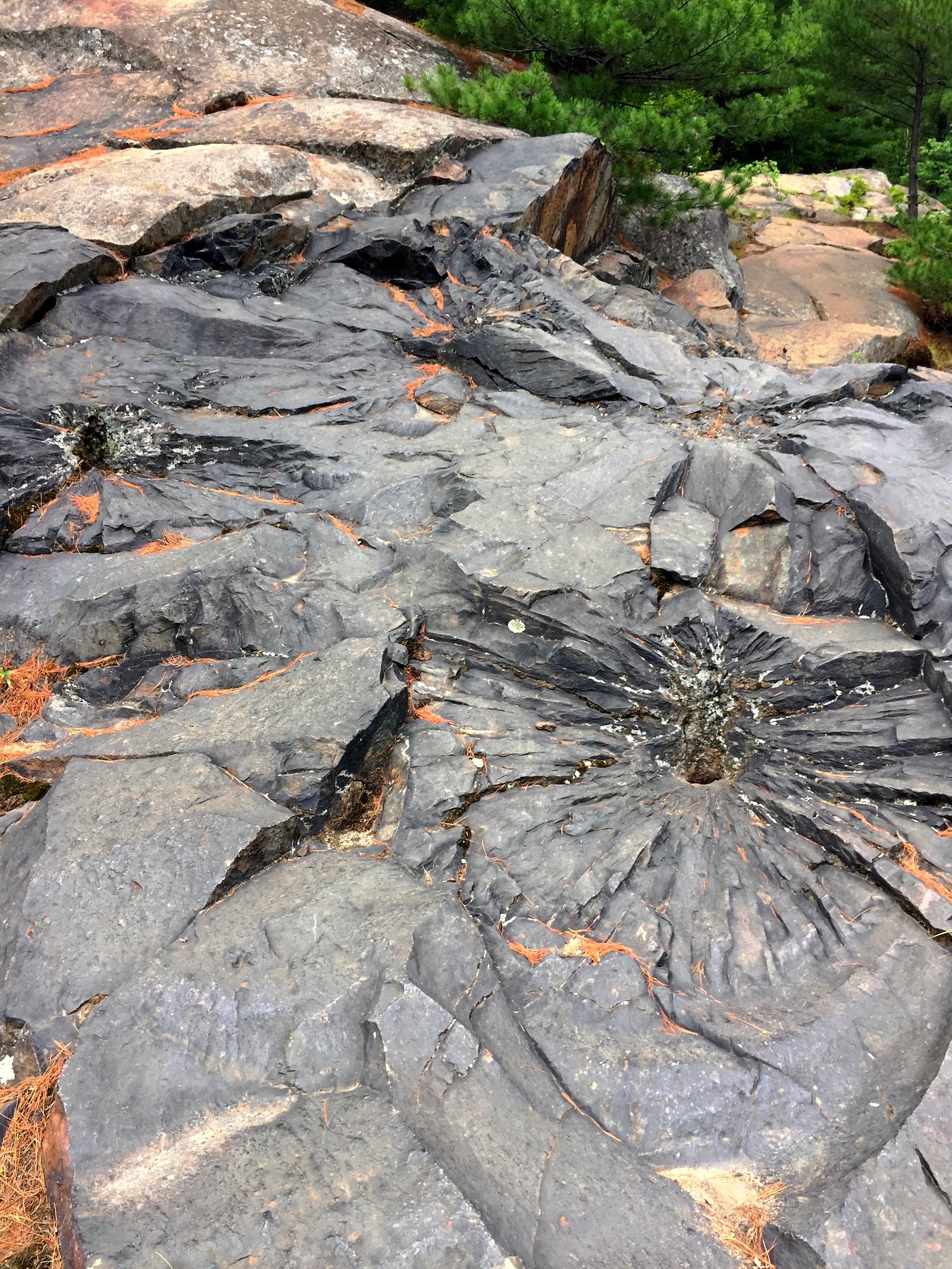 On the way we spotted these curious features. Almost 2 billion years ago, a meteorite collided with earth in this area. There is some claim that these fractures in the rock are related to that impact. But no, these are actually evidence for dynamite explosions. You can read more about both the impact and explosives here.