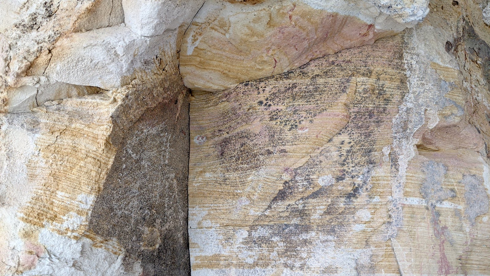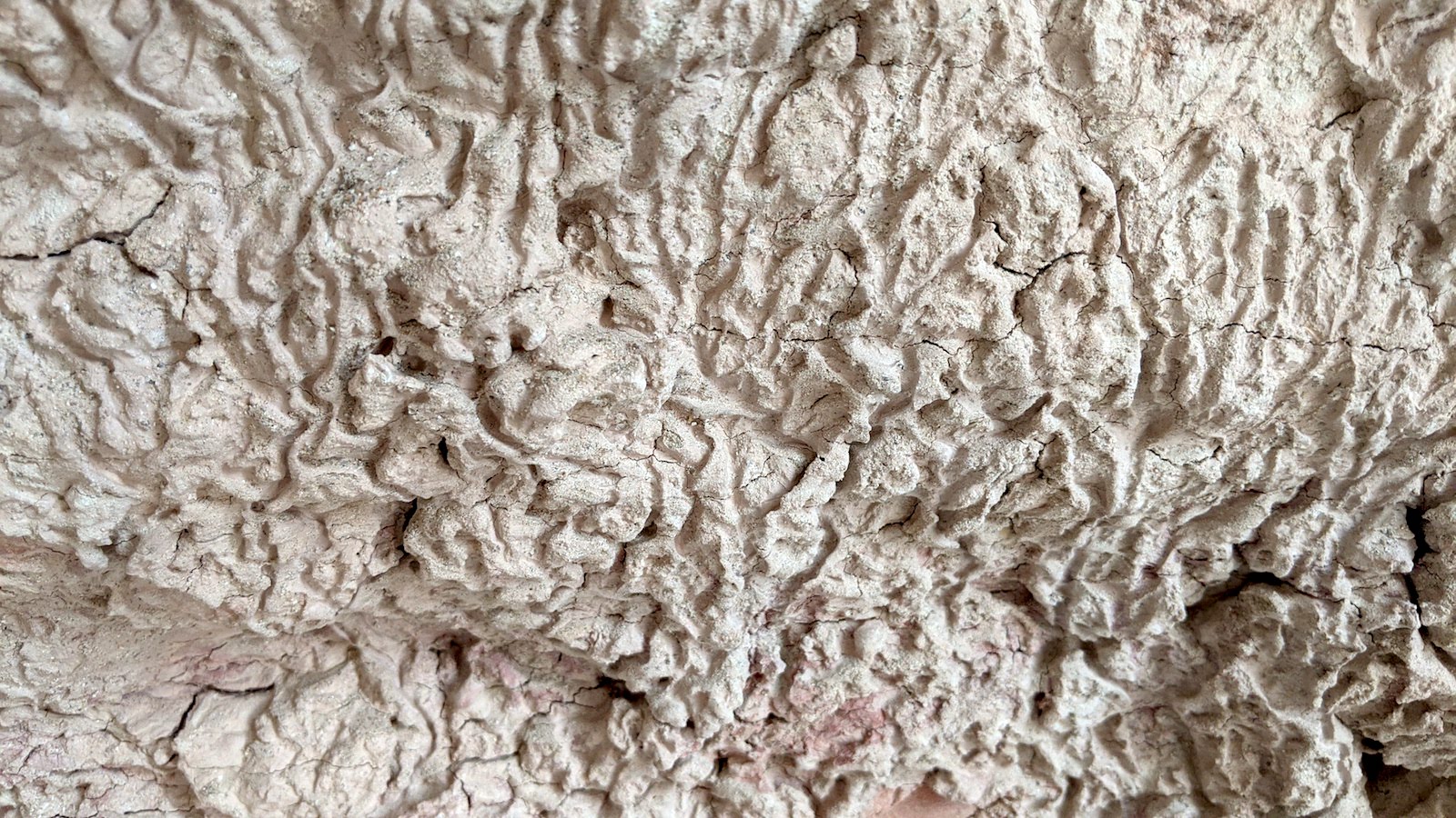 In the photo below you can see a layer of what looks like plaster that formed in a thick layer over the rock.
