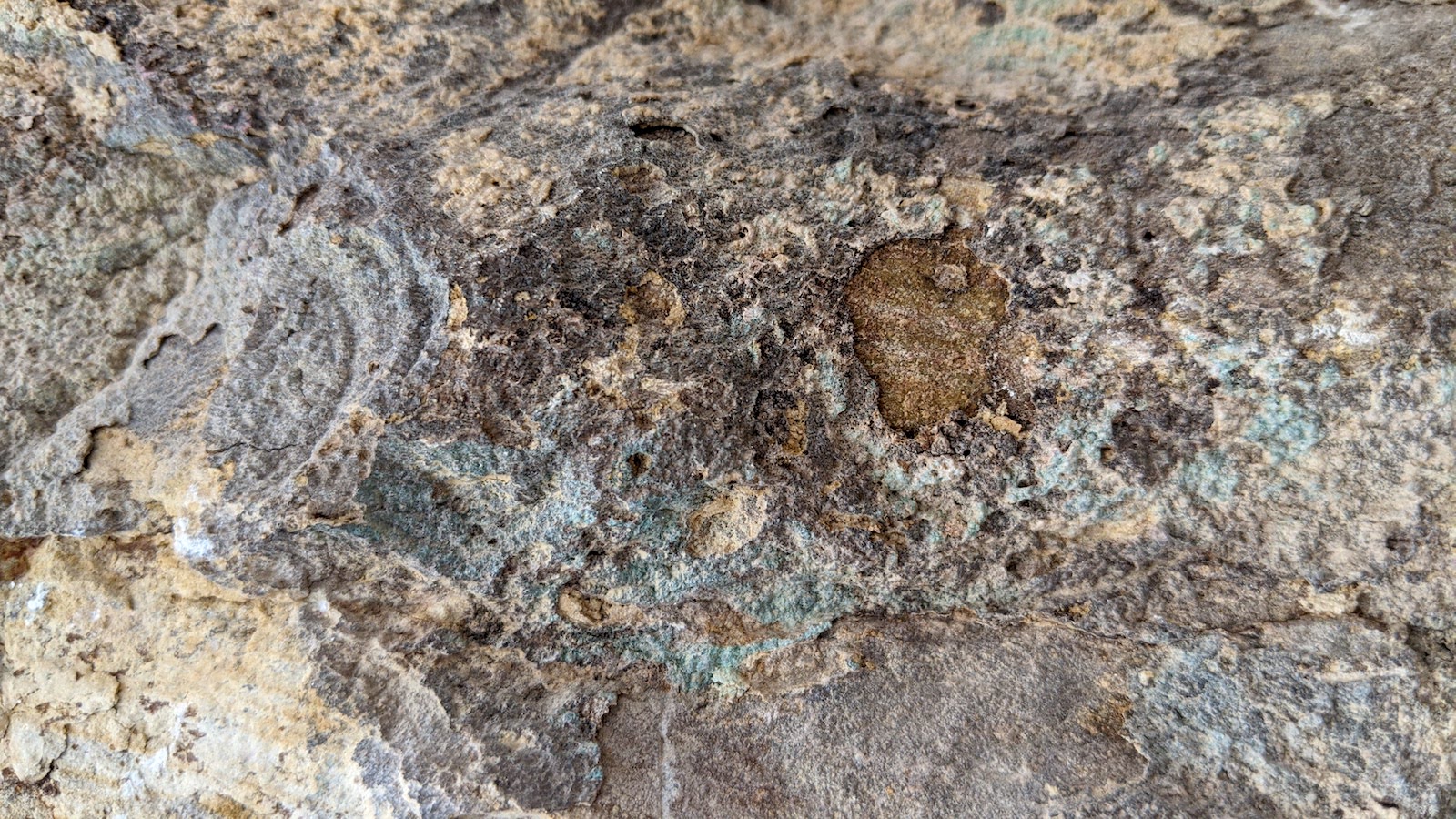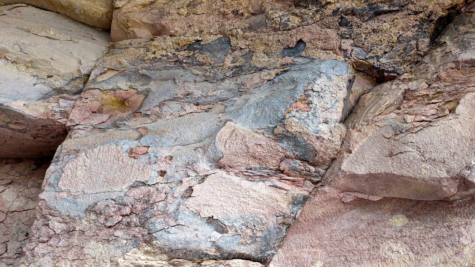 A close look at the face of the rocks reveals interesting textures and inclusions. Some formed by water, some be time and compression.