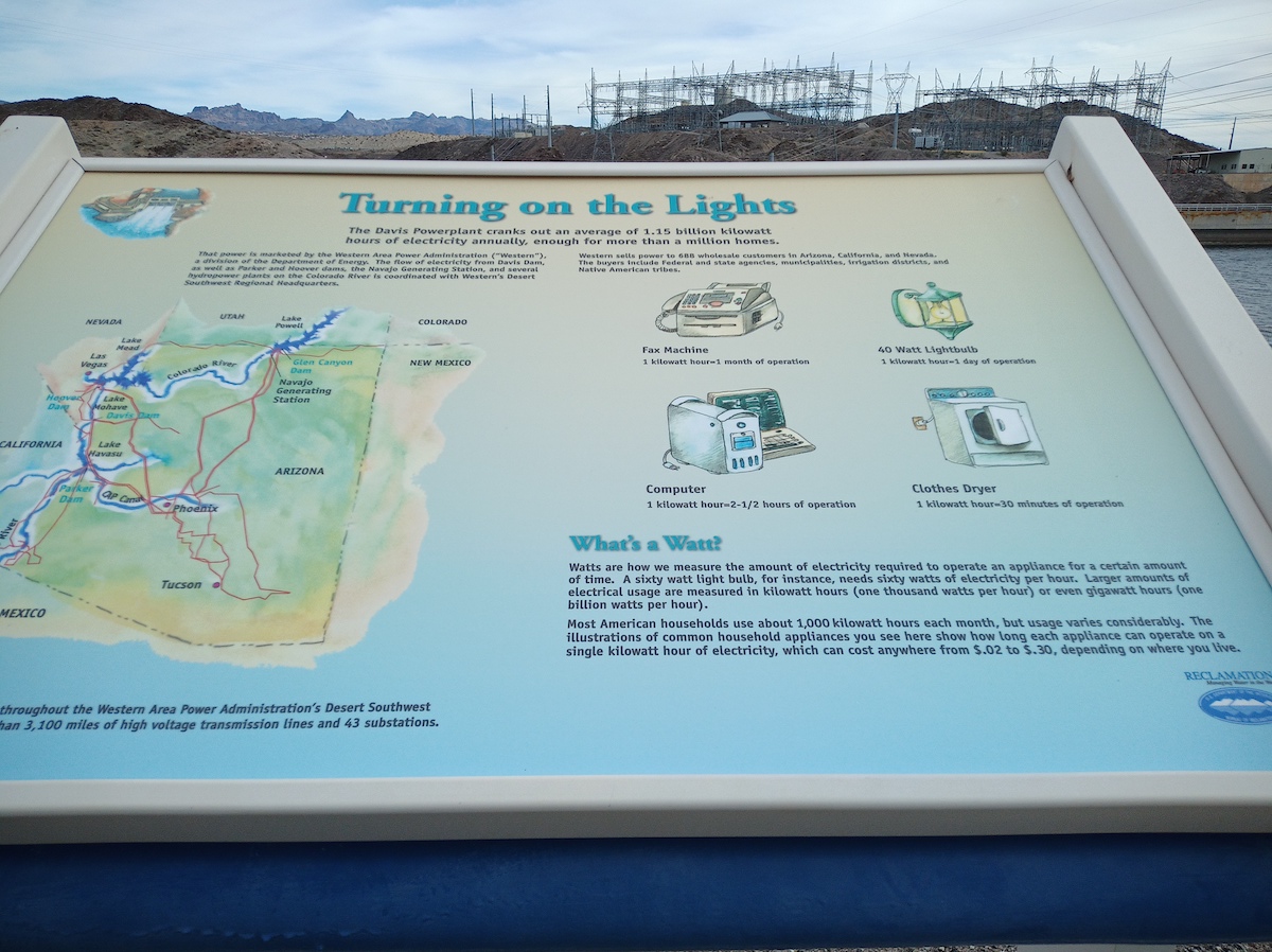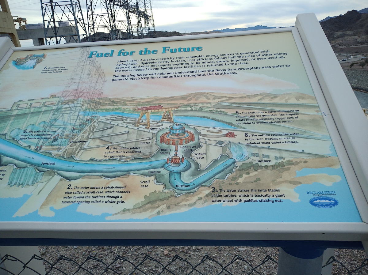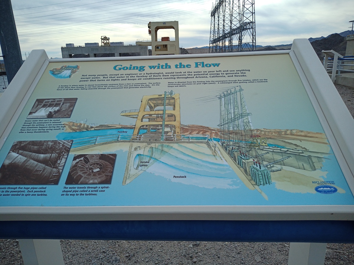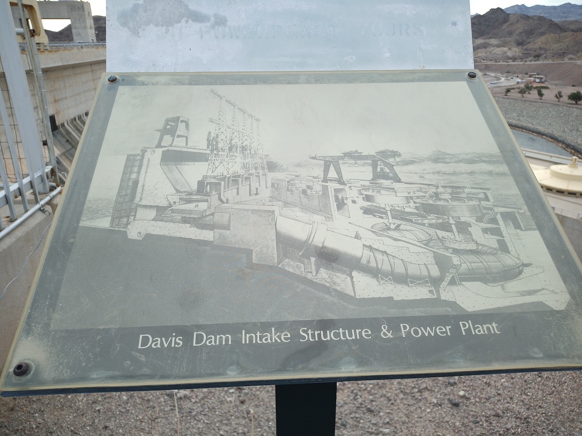 “Davis Dam, rising 200 feet above the lowest point of the foundation and about 140 feet above the level of the river, is a zoned earthfill structure with concrete spillway, intake structure, and powerplant. It has a crest length of 1,600 feet, and a top width of 50 feet. Its reservoir, Lake Mohave, has a total storage capacity of 1,818,300 acre-feet, and at maximum capacity extends 67 miles upstream to the tailrace of the Hoover Powerplant.”